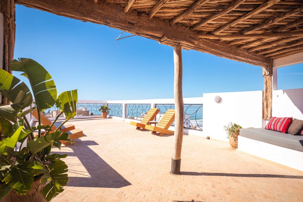 Our second option is our beautiful Surf House Morocco with best sea views. It is located directly behind its partner house, the Sea View Surf Lodge. You have full access to all facilities of the Lodge like the infinity pool, bar and lounge beds but you also have your own panoramic sea view yoga roof top terrace. The Surf House offers a more quite atmosphere as well as charming accommodations